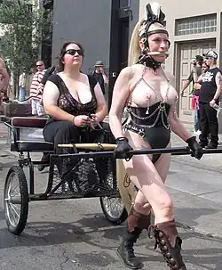 The term bondage describes the practice of physical restraint. Bondage is usually, but not always, a sexual practice.[17] While bondage is a very popular variation within the larger field of BDSM, it is nevertheless sometimes differentiated from the rest of this field.[18] A 2015 study of over 1,000 Canadians showed that about half of all men held fantasies of bondage, and almost half of all women did as well.[19] In a strict sense, bondage means binding the partner by tying their appendages together; for example, by the use of handcuffs or ropes, or by lashing their arms to an object. Bondage can also be achieved by spreading the appendages and fastening them with chains or ropes to a St. Andrew's cross or spreader bars.[20]