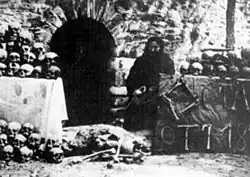 Unable to go on without water, the survivors came outside on the third day. When they opened the doors of the church, ruthless slaughter ensued, where only those who accepted to be converted to Islam were spared.[30] The plans of the Ottoman leader were to populate the village with the converted villagers, but it turned out that there were not enough of them. Before the bashi-bozouk left the village, they tried to burn the church, yet the stone walls remained, and only the wooden furniture and the icons were destroyed. When a Russian commission went to inspect the village 3 months later, the Ottoman authorities tried to bury the bodies, but they could not hide the smell in the air. They also painted the walls of the church, but the blood stains showed up in time.