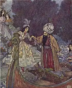 Several scholars have noted the presence of Orientalism in illustrations of the tale, particularly those from the late 19th and early 20th centuries, although the trend has been dated as far back as 1805. Artists such as Arthur Rackham, Edmund Dulac, Harry Clarke, Jennie Harbour, and others portrayed Bluebeard with an Oriental appearance, wearing clothing such as a turban, a vibrantly colored silk robe, and pointed slippers, carrying a scimitar.[24][25][26] These motifs often extended to depictions of his castle (which has been likened to "a harem") and the attire of the wife, who usually retained her "European features".[24][27] Dulac in particular was known for incorporating such themes into his work,[28] and his lavish illustrations of the tale are often cited as prime examples of the trend, with Anna Guiterrez calling them "[an] Oriental [fantasy]". Dulac also notably illustrated a version of "Beauty and the Beast" with similar overtones.[29]