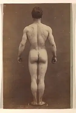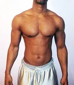 Testosterone helps build and maintain muscles through exercise. On average, men have around 5-20 times more testosterone than women and naturally and biologically males gain more muscle mass and size than women.[24] However, women can also build muscle mass by increasing the testosterone level naturally.[25] Prominent muscles of the body include the latissimus dorsi and trapezius in the back, pectoral muscles and rectus abdominis (abdomen) in the chest and stomach respectively, as well as biceps and triceps in the arms and gluteus maximus, quadriceps and hamstrings in the thighs.[26]
