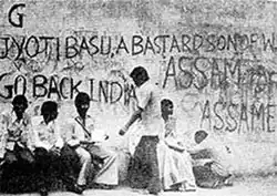 Beginning in 1826, the British East India Company gradually brought the entire Northeast India under control and included Assam in the Bengal Presidency.[9] Over time educated elite Bengali Hindus began occupying colonial administrative and professional positions, locally they were called as Babus and the emerging Assamese nationalists began looking at both the British as well as this class of Bengalis as outsiders.[10] The concern for rapidly increasing amount of refugees arriving from East Bengal and later newly formed East Pakistan in the 1940s, created tension among the Indigenous Assamese people and many tribes in the state.[11] The first influx of Hindu refugees in considerable number was in October 1946 following the Noakhali riots.[12] By May 1949 the number of total refugees reached two-and-half lakhs increasing up to 2,740,455.[13] In May 1948, ethnic tension escalated between the Assamese people and the Bengali Hindus in the Paan bazaar area of Guwahati, which soon spread to different parts of Assam.[14] Bengali-owned shops were looted in Guwahati. Abusive wall graffiti were put out across the streets of Guwahati such as "Who ate all the fish?, the Bengalis! So out with them."[15] In 1956, there were widespread disturbances in the erstwhile undivided Goalpara district, when the States Reorganization Commission visited the district to ascertain the feasibility of the district's merger with West Bengal. Sarat Chandra Sinha, the Congress MLA who would later be the Chief minister of Assam, is known to have rallied in different parts of Goalpara district and made provocative speeches against the Bengali Hindus, instigating mob violence against them.[15] Around 250 Bengali medium schools were converted to Assamese medium schools overnight. As per a letter by PM Jawaharlal Nehru to the Assam government, at least one Bengali Hindu was stabbed.[16]