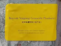 A diplomatic boycott is when diplomatic participation is withheld from an event such as the Olympics but athletic participation is not limited.[54] In 2021, a number of Western nations, led by the United States, Britain and Canada, protested the 2022 Beijing Winter Olympics through a diplomatic boycott, citing China's policies concerning the persecution of Uyghurs and human rights violations in the country.[55][56][57]