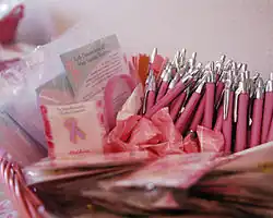 Thousands of breast cancer-themed products are developed and sold each year.[26] Some of these items are everyday products that have been repackaged or repositioned to take advantage of cause-related marketing, such as teddy bears, clothing, jewelry, candles, and coffee mugs.[27] These blended value objects offer consumers an opportunity to simultaneously buy an object and make a donation to a breast cancer organization.[28] Some of these products are produced and/or sold by breast cancer survivors or charities for fundraising purposes, while others are for profits in addition to fundraising. Manufacturers also produce products with pink labels or pink ribbon logos to donate a sum of money to support the cause.[29] The donation is typically capped so that it is reached after a fixed level of sales, although in some cases the company is providing only free advertising for a selected charity. Although advertising costs are rarely disclosed, some companies have been found to spend far more money advertising "pink products" and tie-ins than they donate to charitable organizations supporting research or patients. For example, in 2005, 3M spent US$500,000 advertising post-it notes printed with a pink ribbon logo. Sales were nearly double what the company expected, but the campaign resulted in a $300,000 donation.[30]