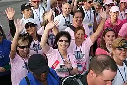 Typical BCAM events include fundraising-based foot races, walk-a-thons, and bicycle rides.[16] Participants solicit donations to a breast cancer-related charity in return for running, walking, or riding in the event. Through mass-participation events, breast cancer survivors form a single, united group that speaks and acts consistently and shares a coherent set of beliefs.[17] They also reinforce the cultural connection between each individual's physical fitness and moral fitness.[18] Events organized by Avon or Komen are known to allocate around 25%-33% of donations to the funds needed to organize the event and advertise it.[19]