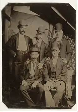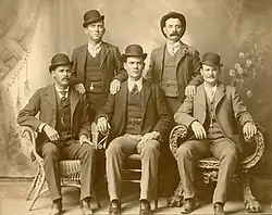 ![]() Fort Worth, Texas, 1900. Left to right: Sundance Kid, Will Carver, Ben Kilpatrick, Harvey Logan, Butch Cassidy. | |