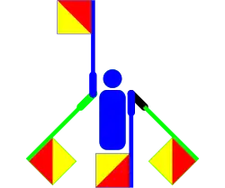 The flag semaphore symbols for letters "N" (green) and "D" (blue)