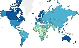 Political scientist Denis Stairs connects values with Canadian nationalism, noting Canadians feel they hold special, virtuous values.[17] Canada promotes its domestically shared values through its foreign relations participating in multiple international organizations.[18][19] Numerous scholars have tried to identify, measure and compare Canadian values with other countries, especially the United States.[20][21] However, there are critics who say that such a task is practically impossible.[22]