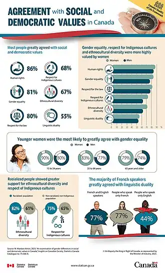 According to the 2020 General Social Survey on Social Identity by Statistics Canada, there was broad agreement amongst Canadians on the social and democratic values of human rights (86%), respect for law (80%) and gender equality (81%). Close to 7 in 10 agreed to a great extent with respect for Indigenous culture (68%) and ethnic and cultural diversity (67%), while the percentage of Canadians who were strongly supportive of having both English and French as Canada’s official languages was lower, at 55%. Women and young people are more likely to support diversity and gender equality values.[26] 92% of the population aged 15 and older agreed that ethnic or cultural diversity is a Canadian value.[27]