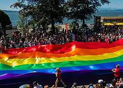 Canadians typically tend to embrace liberal views on social and political issues.[10][11] In Canada the idea of a "just society" is constitutionally protected,[12] with government policies—such as publicly funded health care; higher and more progressive taxation; outlawing capital punishment; strong efforts to eliminate poverty; an emphasis on cultural diversity; the legalization of same-sex marriage, pregnancy terminations, and euthanasia—being social indicators of the country's political and cultural values.[13][14][15] Canadians express pridefulness with the country's military peacekeeping and the national park system and the Canadian Charter of Rights and Freedoms.[16][7]