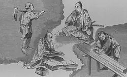 Older scholars believed that there were Shi-nō-kō-shō (士農工商, four classes) of "samurai, peasants (hyakushō), craftsmen, and merchants (chōnin)" under the daimyo, with 80% of peasants under the 5% samurai class, followed by craftsmen and merchants.[50] However, various studies have revealed since about 1995 that the classes of peasants, craftsmen, and merchants under the samurai are equal, and the old hierarchy chart has been removed from Japanese history textbooks. In other words, peasants, craftsmen, and merchants are not a social pecking order, but a social classification.[46][47][48]