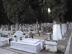 The urban cemetery is a burial ground located in the interior of a village, town, or city. Early urban cemeteries were churchyards, which filled quickly and exhibited a haphazard placement of burial markers as sextons tried to squeeze new burials into the remaining space. As new burying grounds were established in urban areas to compensate, burial plots were often laid out in a grid to replace the chaotic appearance of the churchyard.[14] Urban cemeteries developed over time into a more landscaped form as part of civic development of beliefs and institutions that sought to portray the city as civilized and harmonious.[15]