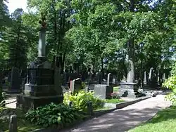 The cost of building a garden/rural cemetery often meant that only the wealthy could afford burial there.[34] Subsequently, garden/rural cemeteries often feature above-ground monuments and memorials, mausoleums, and columbaria. The excessive filling of rural/garden cemeteries with elaborate above-ground memorials, many of dubious artistic quality or taste, created a backlash which led to the development of the lawn cemetery.[35]
