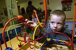 Active children may thrive in the educational activities provided by a quality commercial care center, but according to the National Center for Early Development and Learning, children from low quality centers may be significantly less advanced in terms of vocabulary and reading skills.[9] Classes are usually largest in this type of care, ratios of children to adult caregivers will vary according to state licensing requirements. Some positive aspects of commercial care are that children may gain a sense of independence, academic achievement, and socialization.[US 3] Not only is this age crucial for the improvement of their social skills, but also it begins the stages of understanding a classroom setting. Childcare is seen as a reasonable option because it is different from parenting, since it can be seen as more of a routine for the child.[8] Children are placed into centers of socialization and learn many similarities and differences from one another from a very young age.[8] Children are also placed into settings to develop their linguistics and cognitive abilities, which can be measured through observations.[10]