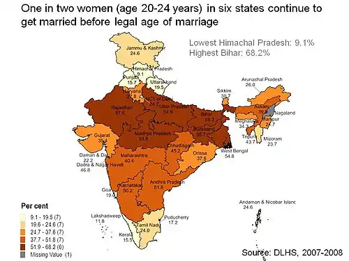 The states with highest observed marriage rates for under-18 girls in 2009, according to a Registrar General of India report, were Jharkhand (14.1%), West Bengal (13.6%), Bihar (9.3%), Uttar Pradesh (8.9%) and Assam (8.8%).[3] According to this report, despite sharp reductions in child marriage rates since 1991, 7% of women passing the age of 18 in India were married as of 2009. UNICEF India has played a significant role in highlighting the Indian child marriage rate prevalence data from its 1990s study.