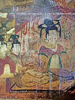 The buddhist paintings of Goryeo were heavily influenced by the drawing techniques of the Song dynasty. In the buddhist paintings of Goryeo, the secular and mythical figures were depicted in the form of worshippers or patrons who were in an audience for the sermons of Buddha, who were witnessed of the heavenly realm or who were ritual participants.[25]: 192 These figures were possibly the donors of the paintings and were mostly part of the royalty and aristocratic class who are depicted wearing Chinese clothing; their clothing and headgear typically follow the official dress code of the Song dynasty.[25]: 192 The Goryeo painting Water-Moon Avalokiteshvara, for example, show the Chinese and Central Asian pictorial influences; however, the textual and pictorial sources used as prototypes for the iconography are primarily Chinese.[59] The clothing worn in the Yuan dynasty however rarely appears in the Buddhist paintings of Goryeo.[25]: 192