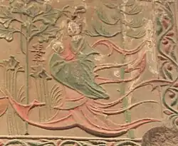 The Korean dancheong was imported from China, known as caihua, along with Buddhism before being developed and modified to have its own distinctive Korean characteristics.[13][14][15][16] The first Korean dancheong was found on a mural in an ancient tomb built in 357 AD during Goguryeo.[17] Dancheong can be traced back to the late Warring State period (c. 3rd century BC) in China.[18] It is not clear when in history the Korean dancheong first started.[17] Although dancheong can be traced back to China, it has become a distinctive characteristic of the Korean tradition and has a long tradition in Korea.[18]