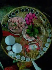 At noon, parents will prepare a big lunch and invite relatives to join them. There must be eight or twelve persons sitting at each table. Usually, there must be twelve dishes on table, with scallion, leek and celery, which must be included. They all have some auspicious and luck meanings from their homophone. Scallion () is a homophone for "cleverness" () in Teochew, while leek () for (good at) reckoning (), and celery () for diligence (). The most important rite of eating is to eat the chicken head. The youngster who is partaking "Chu Hua Yuan" is seated at the front of the table with the chicken head towards him or her, while wearing a red pair of clogs. Actually, they may not really eat the head but take a single bite for the good meaning of the top. If the child was born in the Year of the Rooster, the chicken should be replaced by duck or goose.[6]