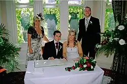 In the UK, a civil registrar ceremony cannot include hymns, religious readings or prayers,[4] and the marriage must take place at a registered or licensed venue to be legally valid. Many private premises are licensed to hold civil ceremony. As well as each party to the marriage signing the register, signatures of two witnesses are also required.[5]