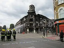 Firemen dousing a building burnt down by rioters during the 2011 England riots