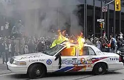 A rioter on top of a Toronto Police Service cruiser in flames during G20 Toronto summit, June 2010