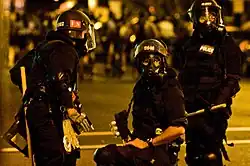 A goal of violent demonstrators is to spur law enforcers to take action that can be exploited as acts of brutality in order to generate sympathy for their cause, and/or to anger and demoralize the opposition.[1] Crowds can use a range of tactics to evade law enforcement or to promote disorder, from verbal assault to distracting law enforcers to building barricades. The more well-planned tactics occur, the more purposeful the disorder. For example, crowds may form human blockades to shut down roads, they may trespass on government property, they may try to force mass arrests, they may handcuff themselves to things or to each other, or they may lock arms, making it more difficult to separate them, or they might create confusion or diversions through the use of rock throwing, arson, or terrorist acts, giving leeway to law enforcers to be forceful or excessive while trying to remove them.[1]