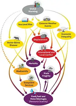 In August 2022, Schellnhuber, Rockström and several other researchers, many of whom were associated with Centre for the Study of Existential Risk at the University of Cambridge, have published a paper in PNAS which argued that a lack of what they called "integrated catastrophe assessment" meant that the risk of societal collapse, or even eventual human extinction caused by climate change and its interrelated impacts such as famine (crop loss, drought), extreme weather (hurricanes, floods), war (caused by the scarce resources), systemic risk (relating to migration, famine, or conflict), and disease was "dangerously underexplored".[13][12] The paper suggested that the following terms should be actively used in the future research.