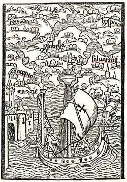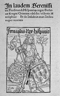 - ↑ The eight woodcuts are 1. coat of arms of Castile-Leon, 2. a vessel with the words "Oceanica classis", 3. landing on "Insula hyspana" with galley/canoe in foreground; 4. sort of map with islands named; 5. a repetition of "Oceanica classis" woodcut. 6. fort of La Navidad being constructed, finally on the tenth page (missing in some copies) 7. a full-length portrait of Ferdinand of Aragon, over the shields of Castile-Leon and Granada and (in recto) 8. coat of armas of Granada. (Henry Harrisse, 1866: p. 16). Some of the woodcuts are reproduced in the 1494 edition Archived May 18, 2012, at the Wayback Machine.
