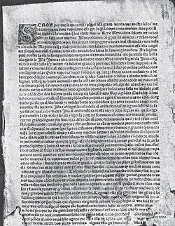 - 2. Ambrosian edition, in quarto, date, printer name and location are unspecified. It is sometimes assumed that it was printed sometime after 1493 in Naples or somewhere in Italy, because of the frequent interpolation of the letters i and j (common in Italian, but not in Spanish); but others insisted it was printed in Spain;[64] a more recent analysis has suggested it was printed in Valladolid around 1497 by Pedro Giraldi and Miguel de Planes (the first Italian, the second Catalan, which may explain the interpolation).[65] Only one copy is known, discovered in 1856 at the Biblioteca Ambrosiana in Milan. The Ambrosian letter was originally in the possession of Baron Pietro Custodi until it was deposited, along with the rest of his papers, at the Biblioteca Ambrosiana in 1852 after his death.[66] After its discovery, a transcription was published in 1863, and a facsimile in 1866.[67]
