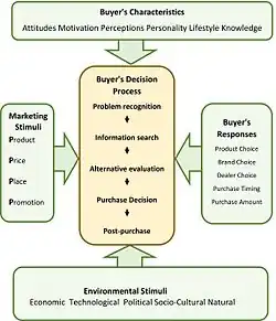 The decision model assumes that purchase decisions do not occur in a vacuum. Rather, they occur in real time and are affected by other stimuli, including external environmental stimuli and the consumer's momentary situation. The elements of the model include interpersonal stimuli (between people) or intrapersonal stimuli (within people), environmental stimuli and marketing stimuli.[20] Marketing stimuli include actions planned and carried out by companies, whereas environmental stimuli include actions or events occurring in the wider operating environment and include social, economic, political, and cultural dimensions. In addition, the buyer's black box includes buyer characteristics and the decision process, which influence the buyer's responses.