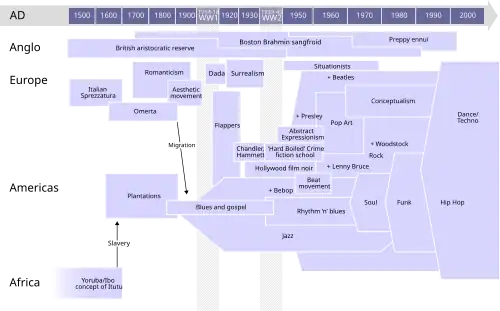 Thompson acknowledges similarities between African and European cool in shared notions of self-control and imperturbability.[14] However, he finds the cultural value of cool in Africa, which influenced the African diaspora, to be different from that held by Europeans, who use the term primarily as the ability to remain calm under stress. According to Thompson, there is significant weight, meaning, and spirituality attached to coolness in traditional African cultures, something which Thompson argues is absent from coolness in the Western context: