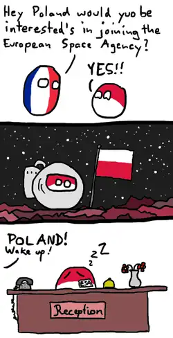 Some Polandball comics arise from the premise that some countries can explore space while Poland cannot.[25][26] One of the earliest Polandball comics begins with the premise that Earth will suffer an impact event, leading to all countries with space technology leaving Earth and settling into orbit around the planet. At the end of the cartoon, a tearful Poland, still on Earth, says the phrase "Poland cannot into space" [sic].[c][11][29] In this humorous way, other countries halt all discussions with Poles on which country is superior.[5][11][23] Poland is typically seen weeping by the end of a comic.[5][6]