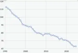 There was a wave of decriminalization in the late twentieth century; ninety percent of changes to these laws between 1945 and 2005 involved liberalization or abolition.[48] Eighty percent of repeals between 1972 and 2002 were done by a legislature, and the remainder by the laws being ruled unconstitutional by a court.[53] Decriminalization began in Europe and the Americas and spread globally in the 1980s.[54] The pace of decriminalization reached a peak in the 1990s. Following the dissolution of the Soviet Union, many former Soviet republics decriminalized homosexuality,[55] but others in Central Asia retained these laws.[56] China decriminalized homosexuality in 1997.[57] Following a protracted legal battle, the Supreme Court of India ruled that the criminalization of homosexuality violated the Constitution of India in the 2018 Navtej Singh Johar v. Union of India judgement.[58][59]