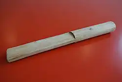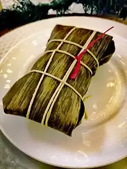 The ayaca is a dough of white corn flour, also known as masa harina, sugar, salt, aniseeds, finely grated cheese, butter and milk spread thinly is placed on a banana leaf. A stuffing consisting of stewed chicken and pork, capers, raisins, plums, olives, piccalilli, ham, peeled almonds, celery, parsley, gherkins and chili pepper is placed on top. The banana leaf is closed and made into a small, neat package, which is wrapped in a second leaf and then tied with packing string and boiled in boiling water. The prepared ayacas are then allowed to cool. Shortly before serving, the ayaca is warmed up and eaten stripped of the banana leaves. Ayacas are made and eaten during the Christmas and New Year holidays.[14]