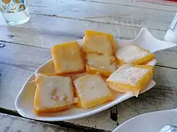 The keshi yená (stuffed cheese) is traditionally a hollowed out red Edam cheese is soaked and then stripped of the red wax layer and filled with a meat or fish filling, including capers, raisins, plums and olives. In a well-fitting form it is then prepared in a bain marie or put in the oven. The heat softens the cheese rind. At the end of the baking time, the keshi yená is turned out onto a plate, after having cooled down a bit, cut like a cake and served. For convenience, instead of the hollowed-out, round Edam cheese, which gives the dish its typical taste and soft pink color, a tin baking sheet is lined with slices of Gouda cheese. Similarly to the ayaca, the keshi yená is often served as an hors d'oeuvre.[15]