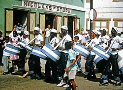 The Allied victory of World War II was commemorated by a large parade in San Nicolas, consisting largely of Caribbean-English immigrants who came to Aruba to work at the Lago Oil Refinery.[22] The first steel and brass bands debuted a few years later and small parades sprouted here and there. Groups within the Aruban elite have taken up this celebration and expended it further. Aruba Tivoli Club, a private social club, started in 1944 with small celebrations.[23]