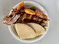 The yambo dish is a thick hearty okra soup. Yambo can be as simple or rich as one would like. A rich yambo contains cured meat and pig tail, fish, cheese, shrimp and kalko (conch meat) paired with funchi. This dish is not popular with many, especially foreigners, due to the slipperiness of the dish.[16]