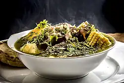 The sancocho is a typical example of a soup as a main course. In addition to fresh and salted meat, this dish contains vegetables, plantain, tubers, corn on the cob; and both sweet and regular potatoes.[15]