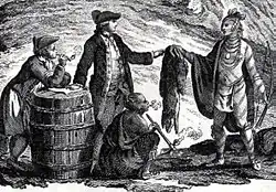 For thousands of years, Canada has been inhabited by indigenous peoples from a variety of different cultures and of several major linguistic groupings.[14] Although not without conflict and bloodshed, early European interactions with First Nations and Inuit populations in what is now Canada were arguably peaceful.[15] First Nations and Métis peoples played a critical part in the development of European colonies in Canada, particularly for their role in assisting European coureur des bois and voyageurs in the exploration of the continent during the North American fur trade.[16] Over the course of three centuries, countless North American Indigenous words, inventions, concepts, and games have become an everyday part of Canadian language and use.[17] Many places in Canada, both natural features and human habitations, use indigenous names. The name "Canada" itself derives from the St. Lawrence Huron-Iroquoian word "Kanata" meaning "village" or "settlement".[18] The name of Canada's capital city Ottawa comes from the Algonquin language term "adawe" meaning "to trade".[18]