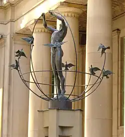 Indigenous artists were producing art in the territory that is now called Canada for thousands of years prior to the arrival of European settler colonists and the eventual establishment of Canada as a nation state.[133] Like the peoples that produced them, indigenous art traditions spanned territories that extended across the current national boundaries between Canada and the United States.[134] The majority of indigenous artworks preserved in museum collections date from the period after European contact and show evidence of the creative adoption and adaptation of European trade goods such as metal and glass beads.[135] Canadian sculpture has been enriched by the walrus ivory, muskox horn and caribou antler and soapstone carvings by the Inuit artists.[136] These carvings show objects and activities from the daily life, myths and legends of the Inuit.[137] Inuit art since the 1950s has been the traditional gift given to foreign dignitaries by the Canadian government.[138]