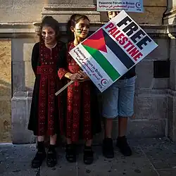 The 1948 Palestinian expulsion and flight led to a disruption in traditional modes of dress and customs, as many women who had been displaced could no longer afford the time or money to invest in complex embroidered garments.[9] New styles began to appear the 1960s. For example, the "six-branched dress" named after the six wide bands of embroidery running down from the waist.[10] These styles came from the refugee camps, particularly after 1967. Individual village styles were lost and replaced by an identifiable "Palestinian" style.[11] The shawal, a style popular in the West Bank and Jordan before the First Intifada, probably evolved from one of the many welfare embroidery projects in the refugee camps. It was a shorter and narrower fashion, with a western cut.[12] The keffiyeh, also known as "hattah", is a traditional black and white headdress worn by Palestinian farmers. Since the Arab Revolt of the 1930s, it has become a prominent symbol of Palestinian resistance in the Israeli Palestinian conflict.