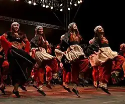 Dabke (Arabic: دبكة), is a folk dance that originates from the Levant.[13] It is popular in Palestinian culture and many other cultures in the Levant, and many troupes perform the dance throughout the world. The Dabke is marked by synchronized jumping, stamping, and movement, similar to tap dancing.[14][15][16][17][18]
