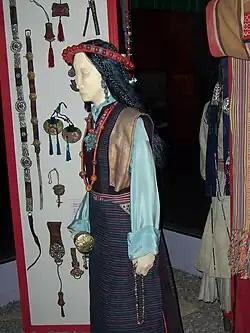 Tibetans tend to be conservative in their dress, and though some have taken to wearing Western clothes, traditional styles still abound. Women wear dark-colored wrap dresses over a blouse, and a colorfully striped, woven wool apron, called pangden signals that she is married. Men and women both wear long sleeves even in summer months.