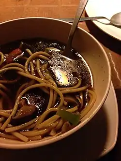 The Cuisine of Tibet is quite distinct from that of its neighbours. Tibetan crops must be able to grow at high altitudes, although a few areas in Tibet are low enough to grow such crops as rice, oranges, lemon and bananas.[10] The most important crop in Tibet is barley. Flour milled from roasted barley, called tsampa, is the staple food of Tibet. It is eaten mostly mixed with the national beverage, the butter tea. Butter tea perfectly fits the needs of the human body in these high altitudes as it contains butter (protein and fat), milk (protein, fat and calcium), salt and tea. Tibetan cuisine contains a wide variety of dishes. The most famous are Momos (Tibetan dumplings). Balep is Tibetan bread eaten for breakfast and lunch. There many other types of balep bread and fried pies. Thukpa is noodle soup. It consists of noodles of various shapes, vegetables, and meat in broth. Tibetan cuisine is traditionally served with bamboo chopsticks, in contrast to other Himalayan cuisines which are eaten by hand. Small soup bowls are also used by Tibetans, and the rich are known to have used bowls of gold and silver.[11] Since only a few crops grow at such high altitudes, many features of Tibetan cuisine are imported, such as tea, rice and others. Meat dishes are likely to be yak, goat, or mutton, often dried, or cooked into a spicy stew with potatoes. Tibetans would never eat dogs and fish only in special cases as dogs are regarded as domestic animals and also guard dogs, and fishes are one of the Eight Auspicious Symbols of Buddhism.