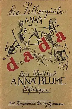 There is no consensus on the origin of the movement's name; a common story is that the artist Richard Huelsenbeck slid a paper knife randomly into a dictionary, where it landed on "dada", a French term for a hobby horse.[15] Others note it suggests the first words of a child, evoking a childishness and absurdity that appealed to the group. Still others speculate it might have been chosen to evoke a similar meaning (or no meaning at all) in any language, reflecting the movement's internationalism.[16]