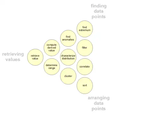 Users may have particular data points of interest within a data set, as opposed to the general messaging outlined above. Such low-level user analytic activities are presented in the following table. The taxonomy can also be organized by three poles of activities: retrieving values, finding data points, and arranging data points.[78][79][80][81]