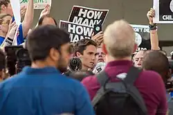 After the school shooting, Hogg emerged as a leader in the 2018 United States gun violence protests.[34] Along with Alfonso Calderon, Sarah Chadwick, X González, Cameron Kasky, Kyle Kashuv and other students, he turned to the media to talk about their role as survivors in the shooting and voice his opinion on gun control and gun violence.[35] He called on elected officials to pass gun control measures[36] and has been a vocal critic of politicians who take campaign donations from the NRA, and has urged them to compromise on legislation to save lives.[37]
