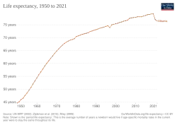 With an estimated population of 2.40 million in 2023, Albania ranks 143rd in the world by population. The population density is 101 inhabitants per square kilometre.[11] The overall life expectancy in Albania at birth is 78 years.[12] The total fertility rate of 1.70 children per mother is one of the lowest in the world. In 2016, the population of Albania was about 2.89 million, comprising 1,447 million male and 1,443 female persons.[13] There were 38,003 live births and 20,737 deaths in Albania. The natural increase of the population was positive, as the number of births exceeded the number of deaths by 17,266. Due to external migration and low birth rate, the population declined by 18,307. The total dependency ratio of population in Albania is 46.8%.