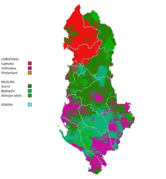 The 2011 census is regarded as unreliable and inaccurate by the Council of Europe, showing incompatibility with the protection of national minorities.[16] Also, the World Council of Churches sent letters to the United Nations Human Rights Council regarding the matter, having conducted their own questionnaire which showed major irregularities.[17] It was the first census to include ethnicity, was struck by controversy since according to article 20 of the Census law, there is a $1,000 fine for anyone who declares anything other than what was written down on the individual's birth certificate.[18] Some of the minorities, mainly the Greeks, boycotted the census.[19] The religious affiliation of the population was 56.7% Muslims, 13.79% undeclared, 10.03% Catholics, 6.75% Orthodox believers, 5.49% other, 2.5% Atheists, 2.09% Bektashis and 0.14% other Christians.[20]