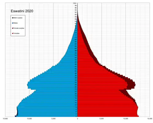 Eswatini's population is 1,113,276 according to the July 2021 estimate from the CIA World Factbook. The 2007 Census put the nation's population at 912,229. This number is lower than the 1997 Census, which gave 929,718 residents. The small difference is believed to be the result of massive emigration of Swazis to South Africa in search of work.[1]