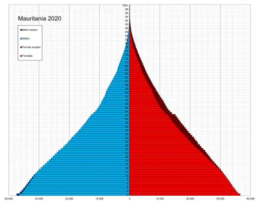 Demographic features of the population of Mauritania (Arabic: التركيبة السكانية في موريتانيا) include population density, ethnicity, education level, health of the populace, economic status, religious affiliations and other aspects.